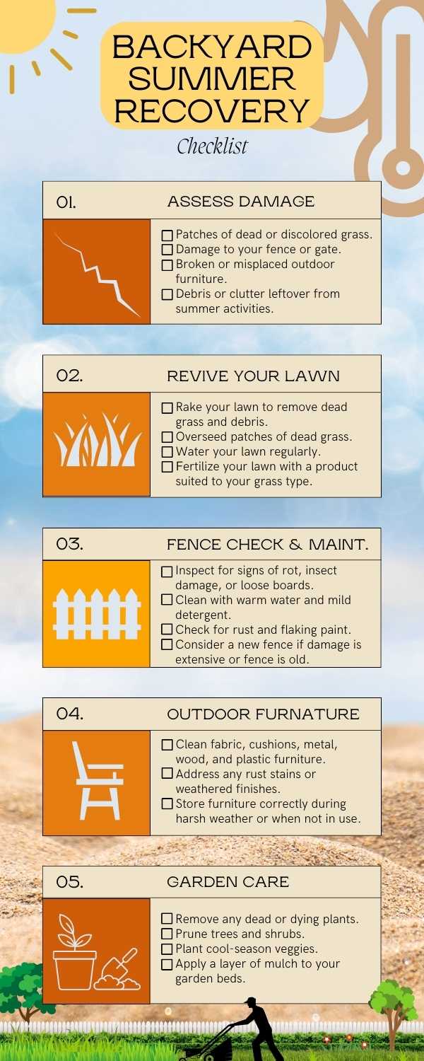 Before you can begin restoring your backyard, it's essential to assess the damage. Take a walk around your backyard and look for these common post-summer issues: